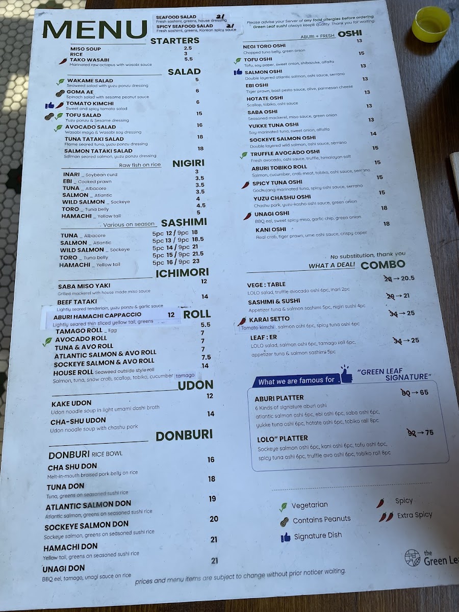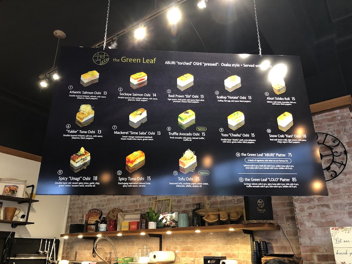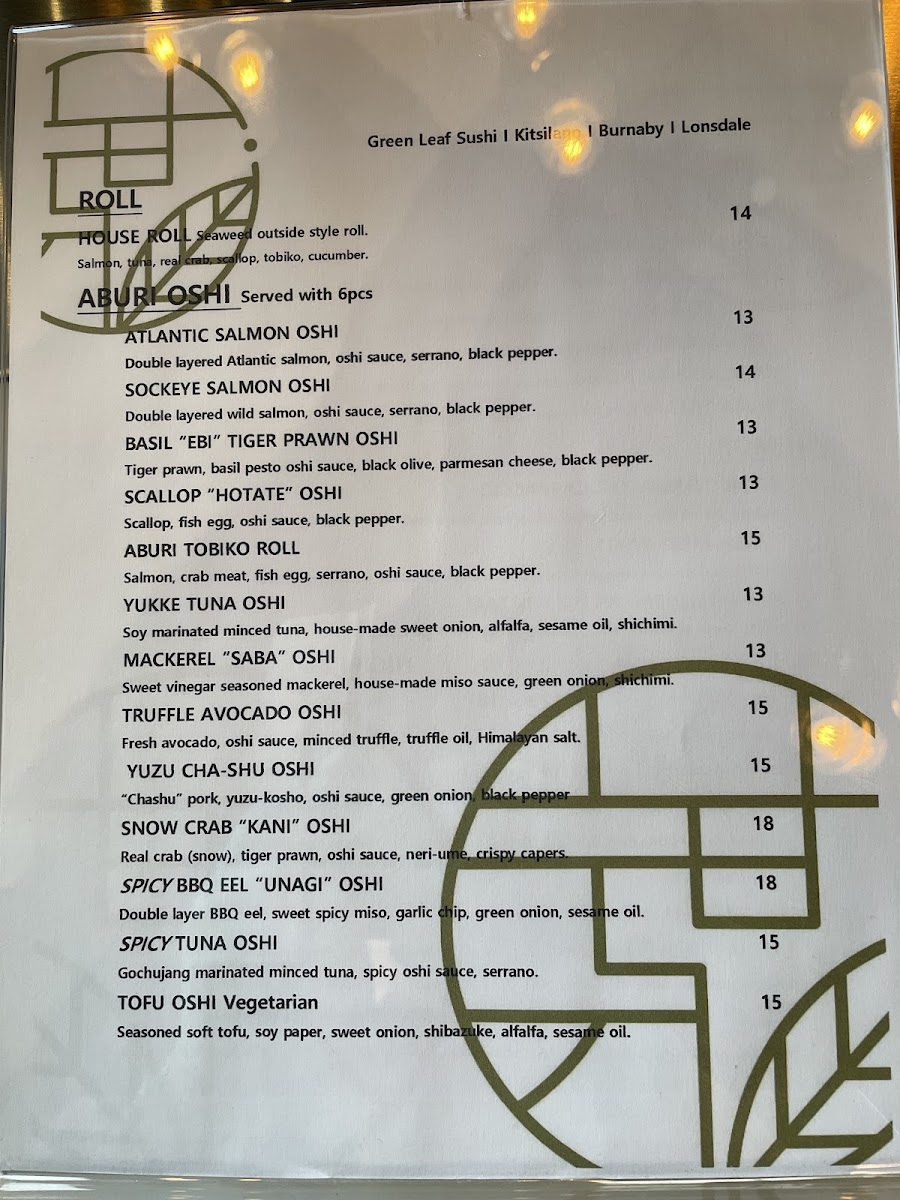 The menu at Green Leaf Sushi North Vancouver features a variety of Japanese dishes with a focus on sushi and sashimi preparations, alongside light salads and rice bowls. It is structured to offer a selection of specialty Oshi Sushi options—pressed sushi with layered ingredients—as well as various rolls and donburi rice bowls.