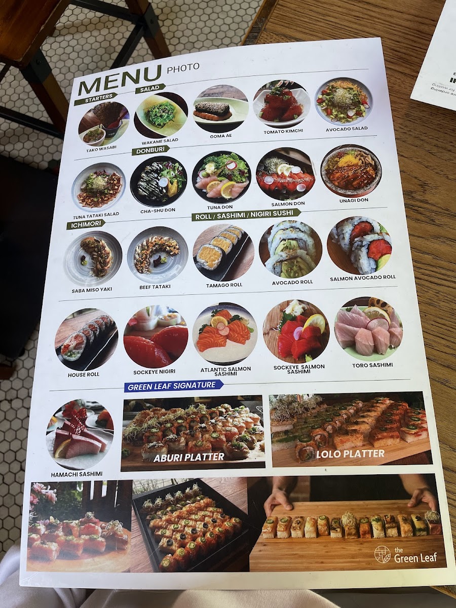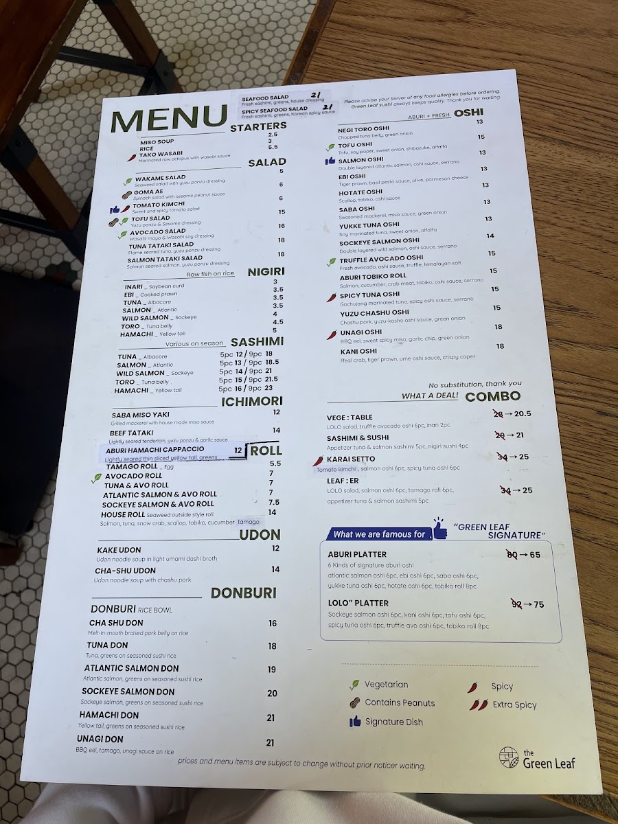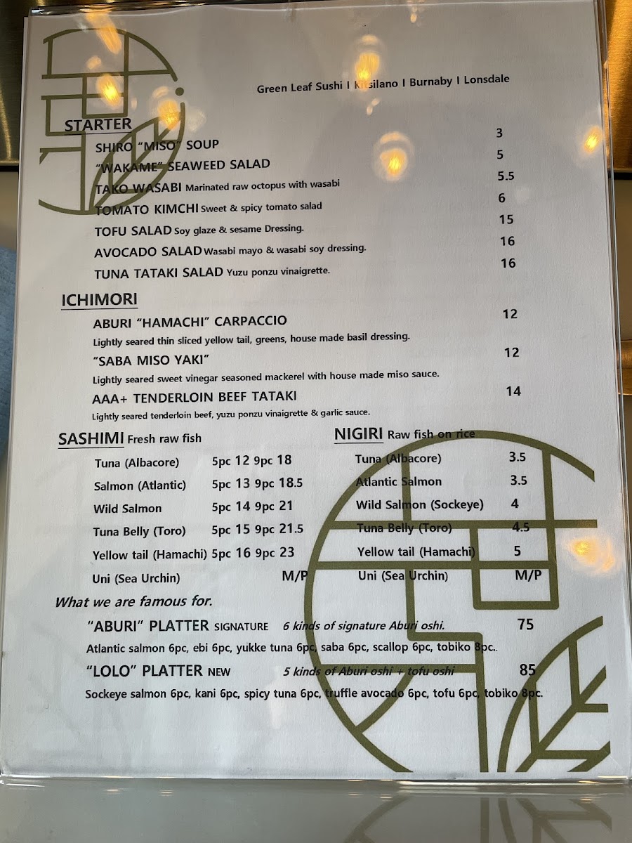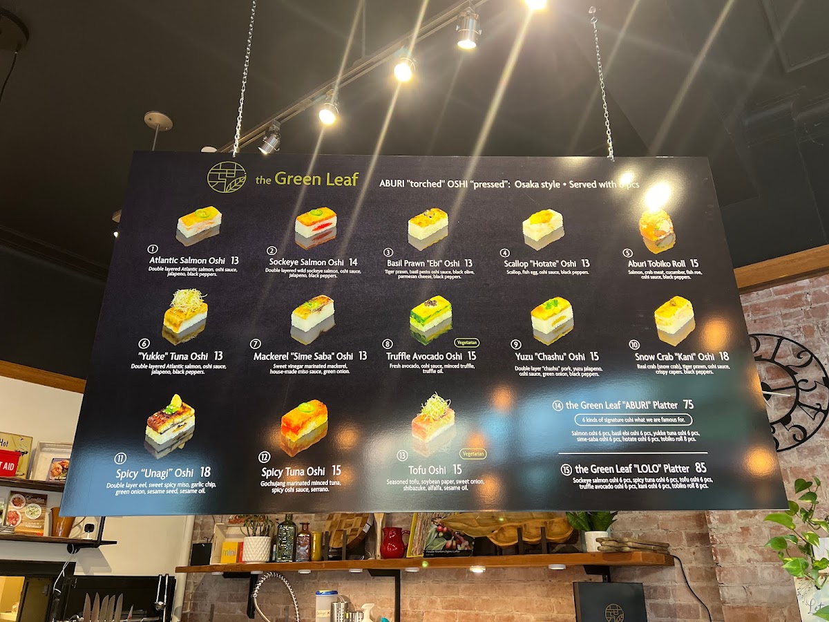 The menu at Green Leaf Sushi North Vancouver features a variety of Japanese dishes with a focus on sushi and sashimi preparations, alongside light salads and rice bowls. It is structured to offer a selection of specialty Oshi Sushi options—pressed sushi with layered ingredients—as well as various rolls and donburi rice bowls.